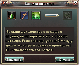 Шаг 4: Нажмите кнопку «Закалить», чтобы открыть меню закалки питомца. Положите «Экстракт духа», «обычную душу» и любое оружие подходящего для питомца уровня в соответствующие ячейки появившегося окна и нажмите кнопку «Закалить».